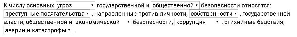 нужно выбрать правильный ответ. В первом пропуске: Угроз,опасностей,факторов. 2:общественной,личной. 3:прест. посягательства,негат. действий, угрозы. 4:собственности,имущества,граждан. 5:экономич.,политич., информационной,военной. 6:коррупция,преступность,наркомания. 7:аварии и катостр.,взрывы,техног.аварии,уровень смертности