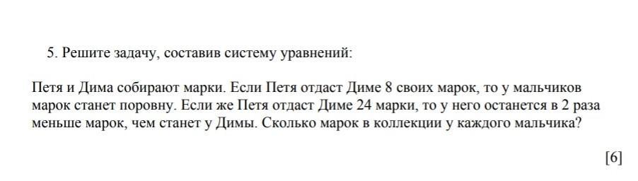 Пусть у Пети было х марок, у Димы було у марок. Тогда по условию: