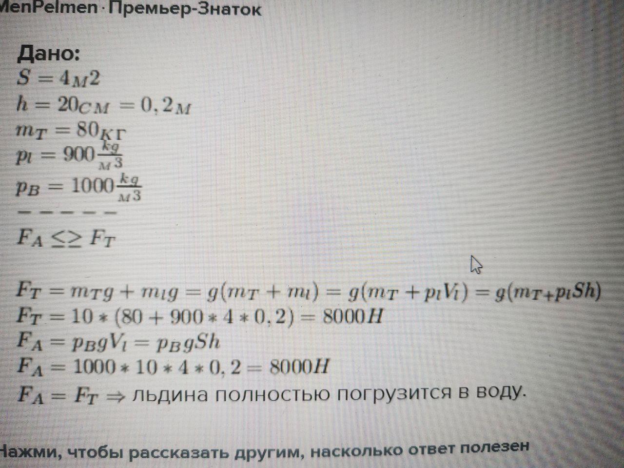 Льдина, площадь которой 5м2, толщина 25см. Погрузится ли она полностью в воду, если на неё встанет человек массой 70кг? Плотность льда 900 кг/м3.