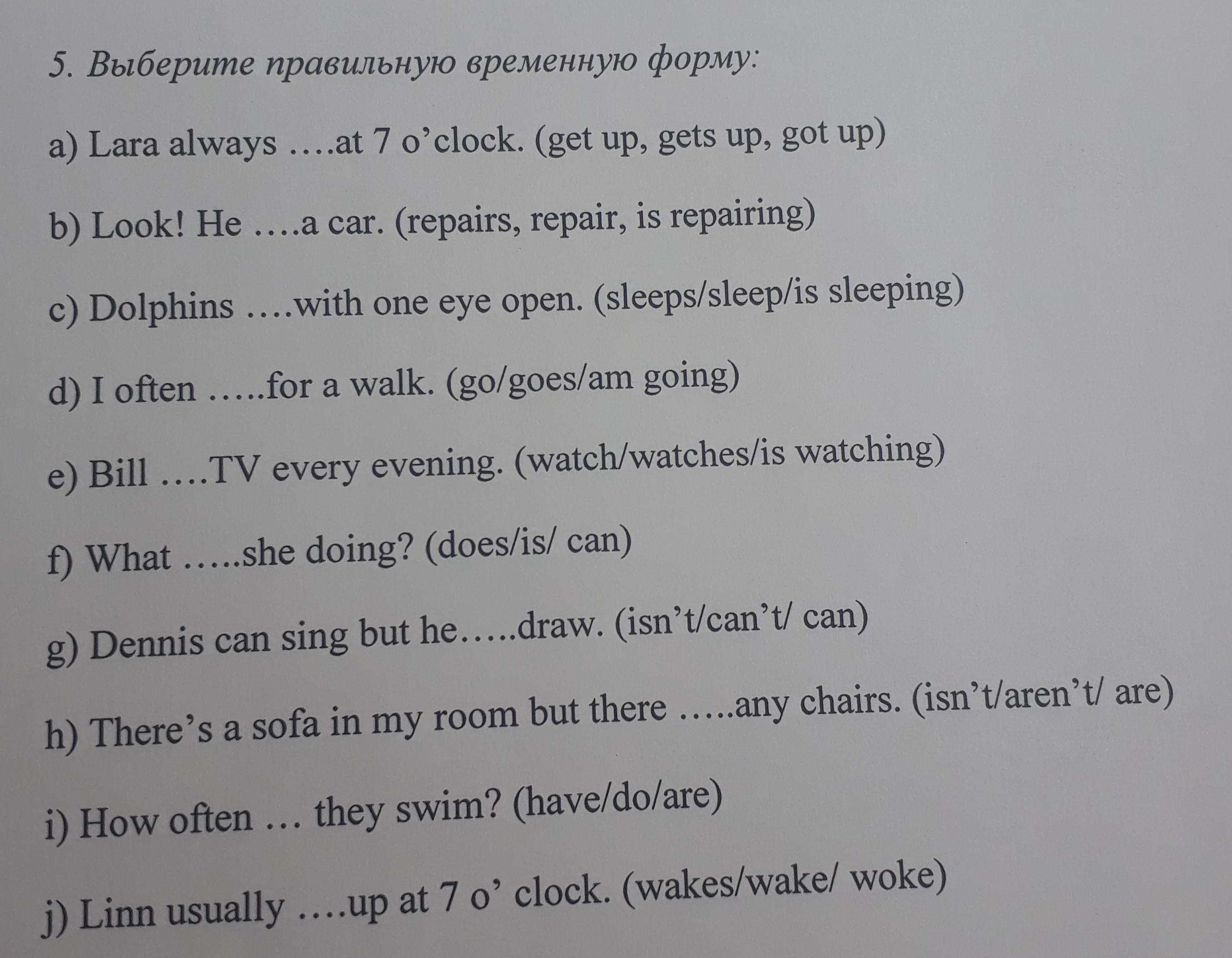 д) Bill ... TV every evening.(watch, watches, is watching)