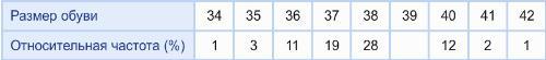 Для определения плана закупок менеджер магазина составил таблицу относительной частоты (в процентах) размеров проданной за месяц женской обуви. Найдите пропущенное значение относительной частоты.