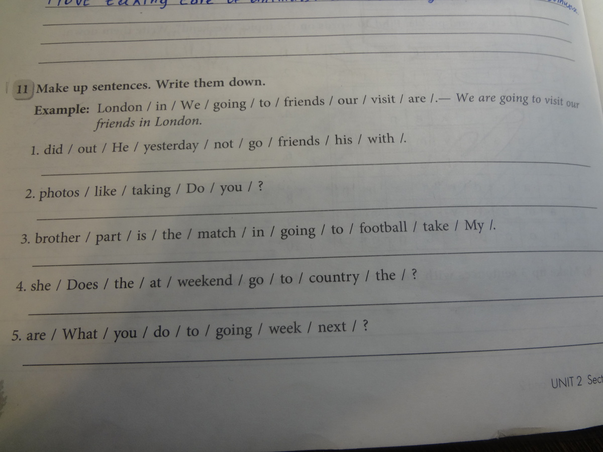 what are you going to do next week.does she go to the country at weekend.is my brother going to take part in the football match.do you leki takin g photos.didn*t he go out with his friends yesterday