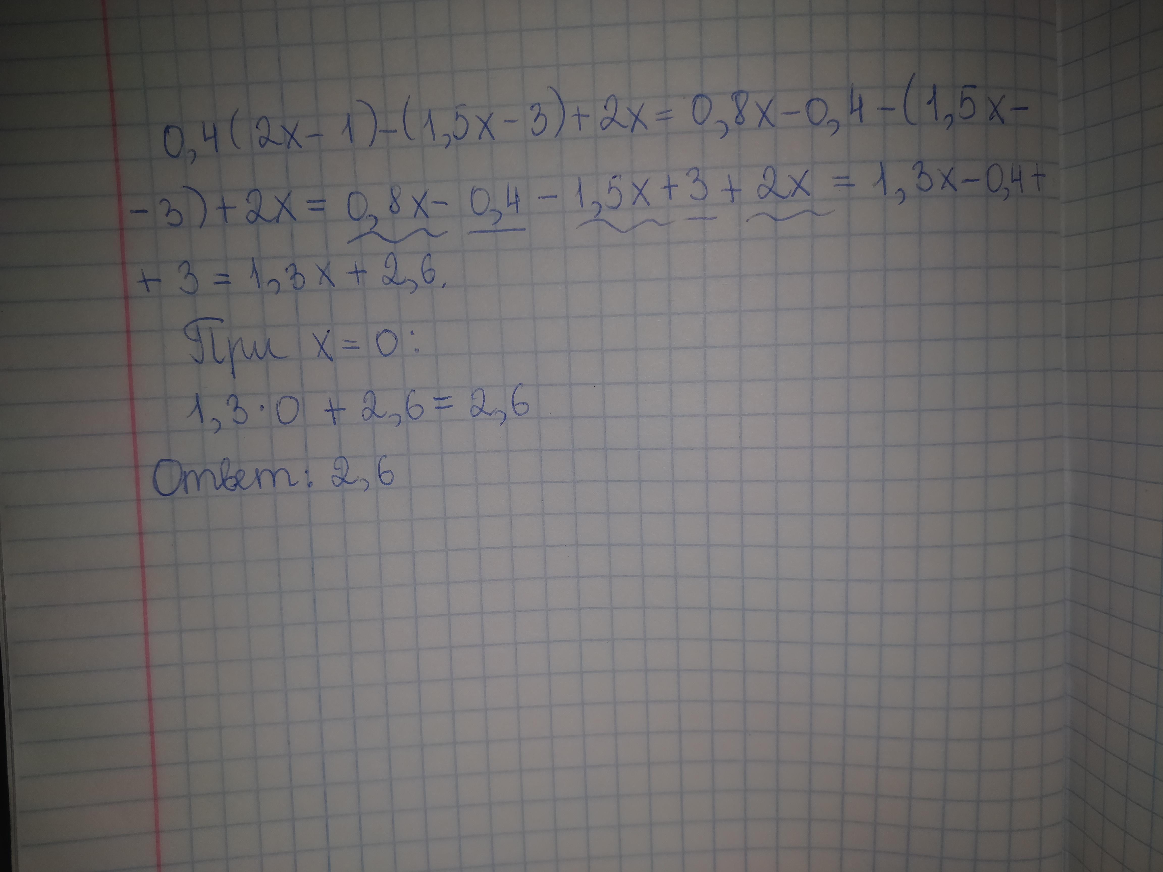 0,4(2х-1) – (1,5х-3)+2х и найдите его значение при х=-0,