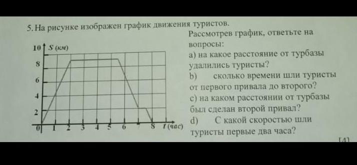 d) Первые 2 часа туристы шли со скоростью 9:2 = 4,5км/ч.