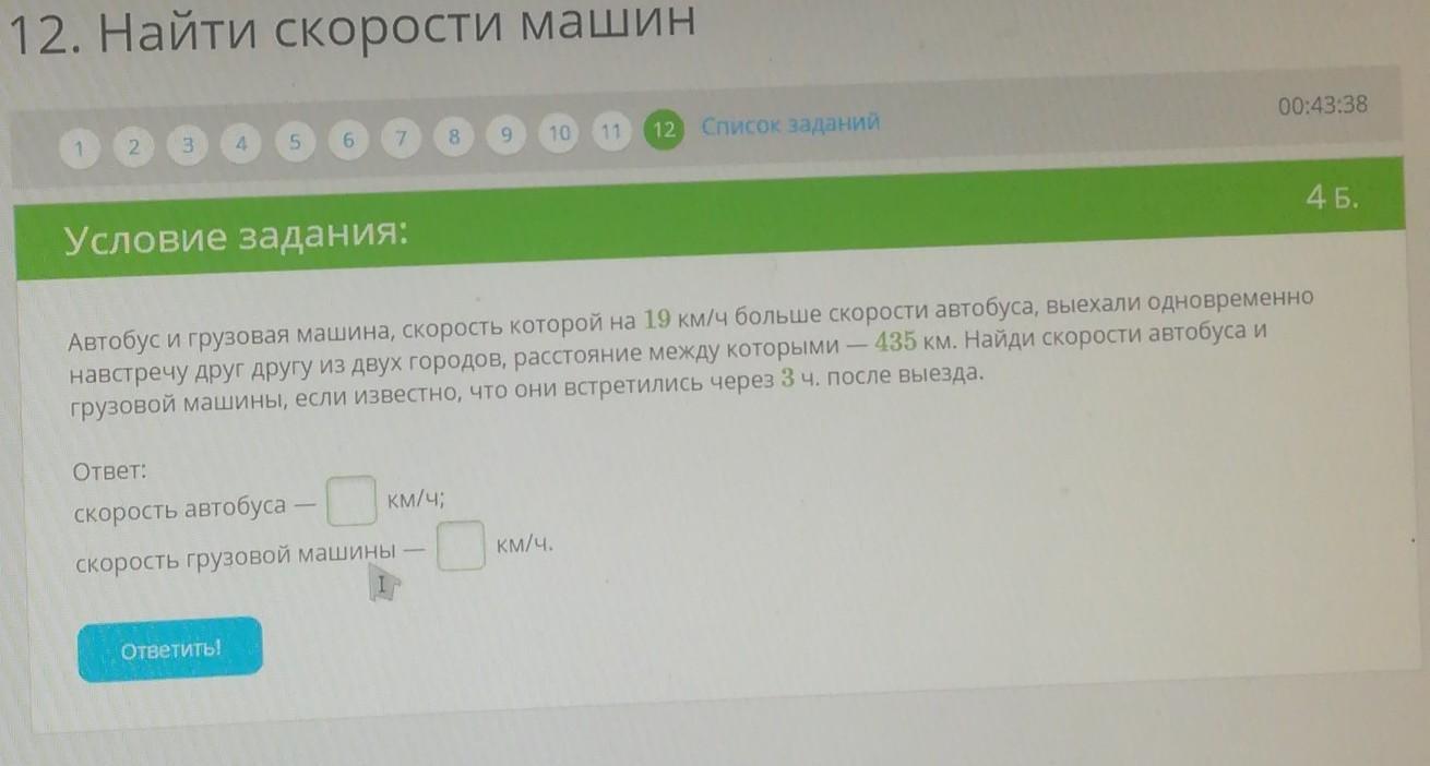 пусть х - скорость автобуса, тогда (х+19) - скорость авто