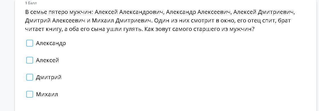 Судя по условию, в задаче есть человек, у которого есть отец, брат и 2 сына. Допустим, что эти два сына - Алексей Дмитриевич и Михаил Дмитриевич. Тогда Дмитрий Алексеевич - их отец, Александр Алексеевич - брат Дмитрия, а Алексей Александрович - отец Дмитрия.