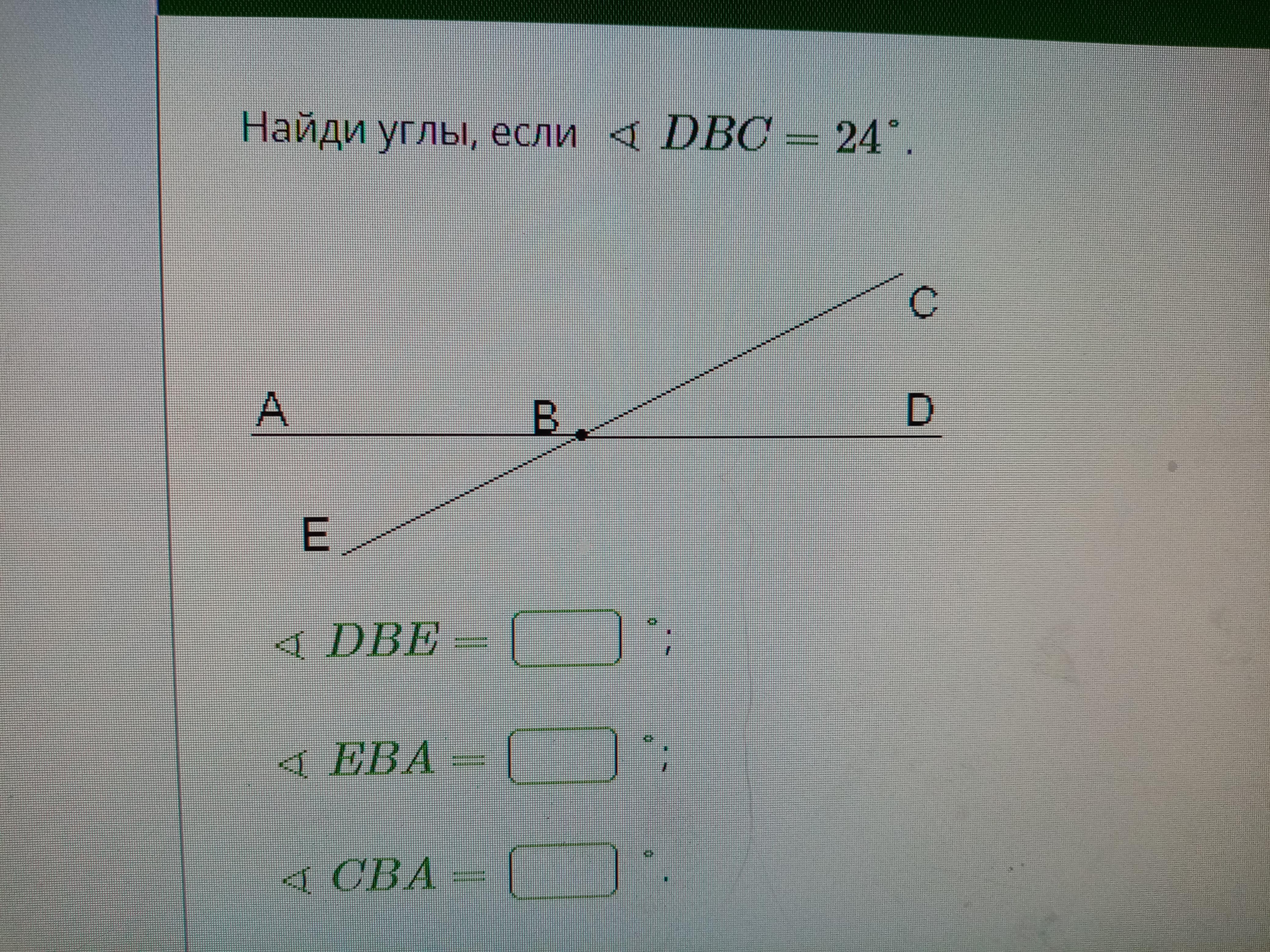 180-24=156. Угол DBE=156 и равен углу СВА,т.к. вертикальные.
