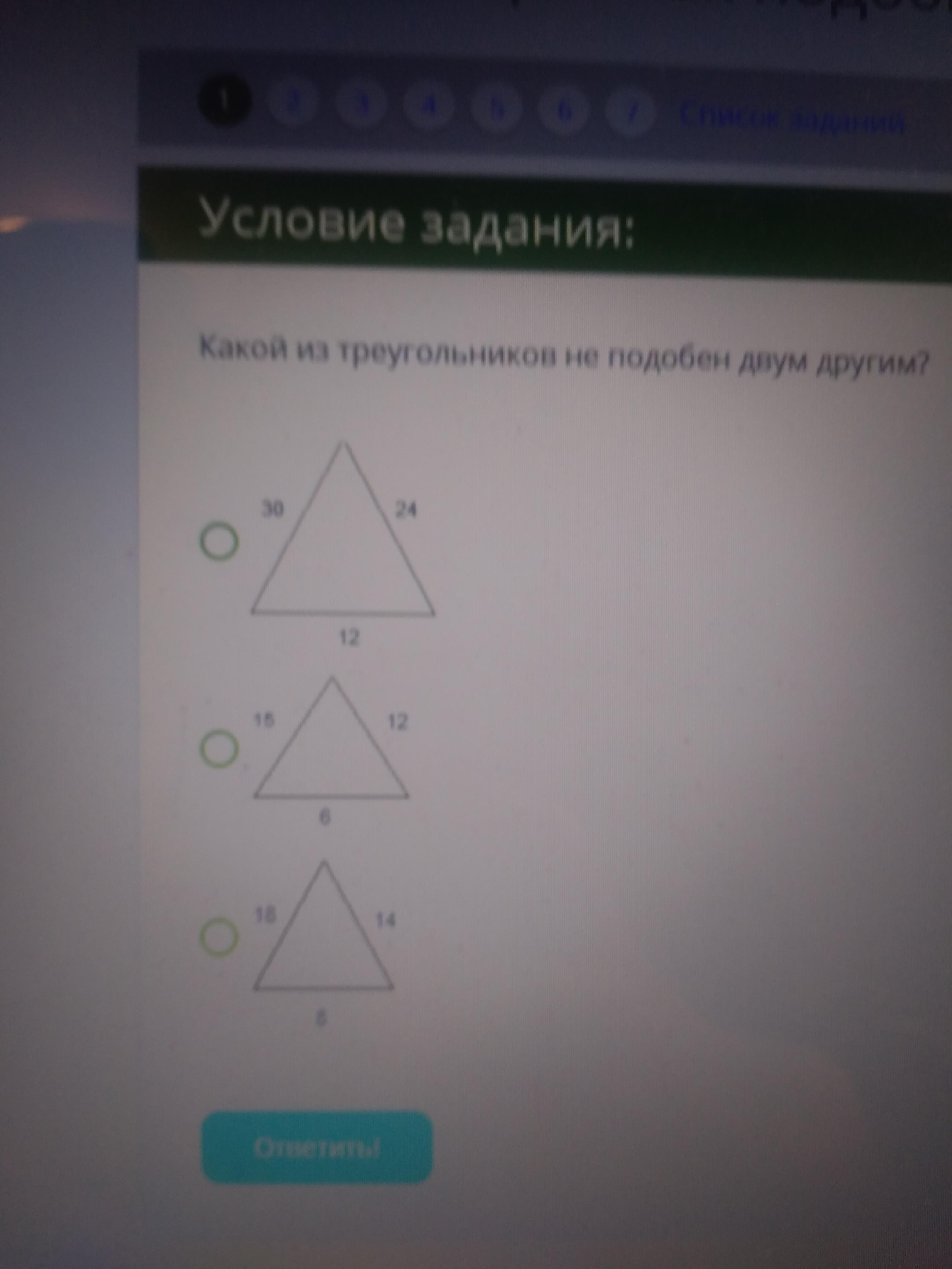 Объяснение: очевидн0 первые 2 треуг. подобны с k=2, третий не подобен ни одному из 2х выше