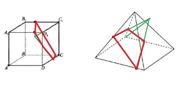Надо применять дополнительные построения для определения точек пересечения секущей плоскости с гранями фигуры.