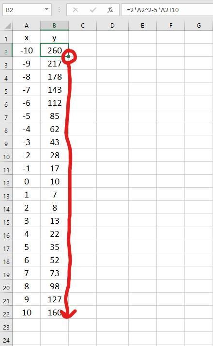 Пусть от A2 до A22 будут значения от -10 до 10. Тогда пишем в ячейку B2 нашу формулу, начиная со знака равно, заменяя x на A2. Потом зажимаем маленький квадратик в нижнем правом углу ячейки и протягиваем вниз до B22 (см. фото). Вот и всё.