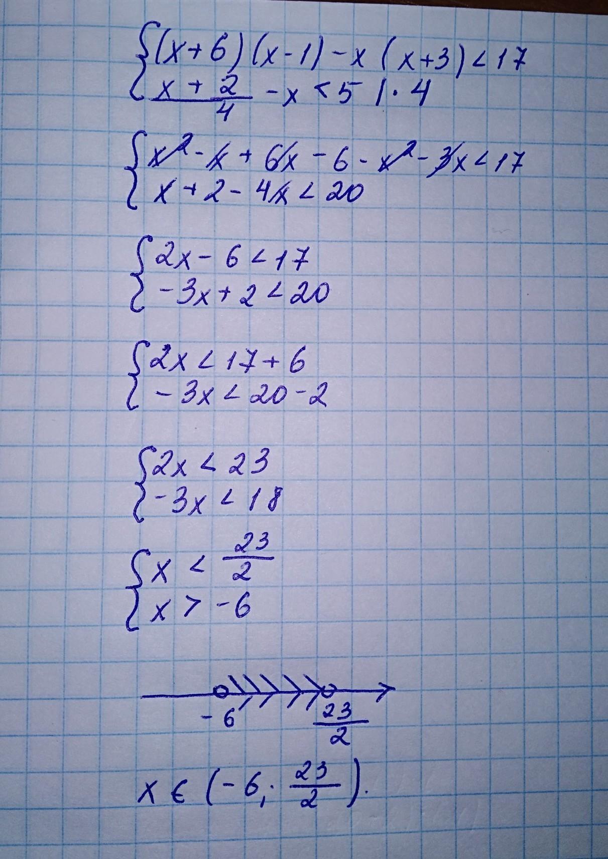 Знайдіть розв'язок системи нерівностей {(x + 6)(x-1) - x(x + 3 < 17 { x+2/4 - x < 5