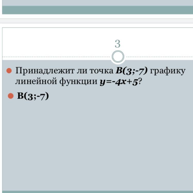 Точка В(3; - 7) - належить графіку функції у=- 4х+5