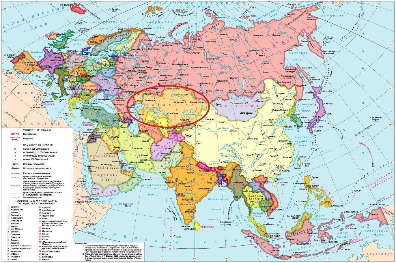 Казахстан расположен к северу от экватора, восточнее 0 меридиана,на материке Евразия.Большая часть страны расположена в Азии, а меньшая в Европе.