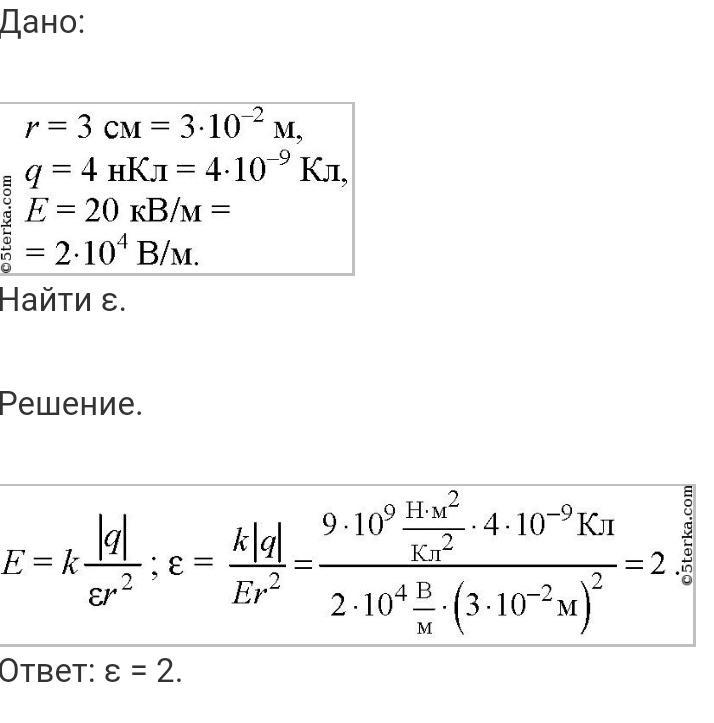 На відстані 4 см від заряду 4 нКл, який міститься в рідкому діелектрику, напруженість поля дорівнює 20 кВ/м. Яка діелектрична проникність діелектрика?