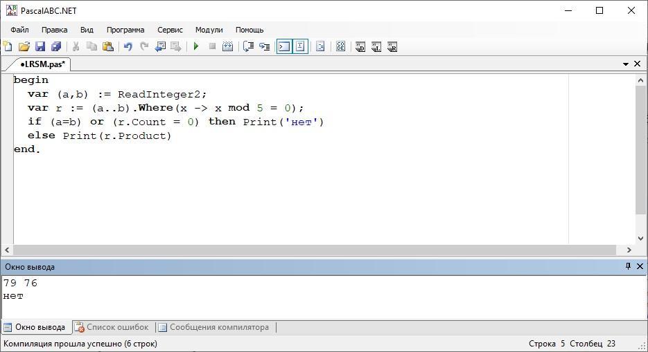 Вводится два любых числа а и b. Вычислить произведение чисел кратных 5,от меньшего из введенных чисел,до большего. Если числа a и b одинаковы или в данном диапазоне таких чисел нет, то в ответе написать «нет»