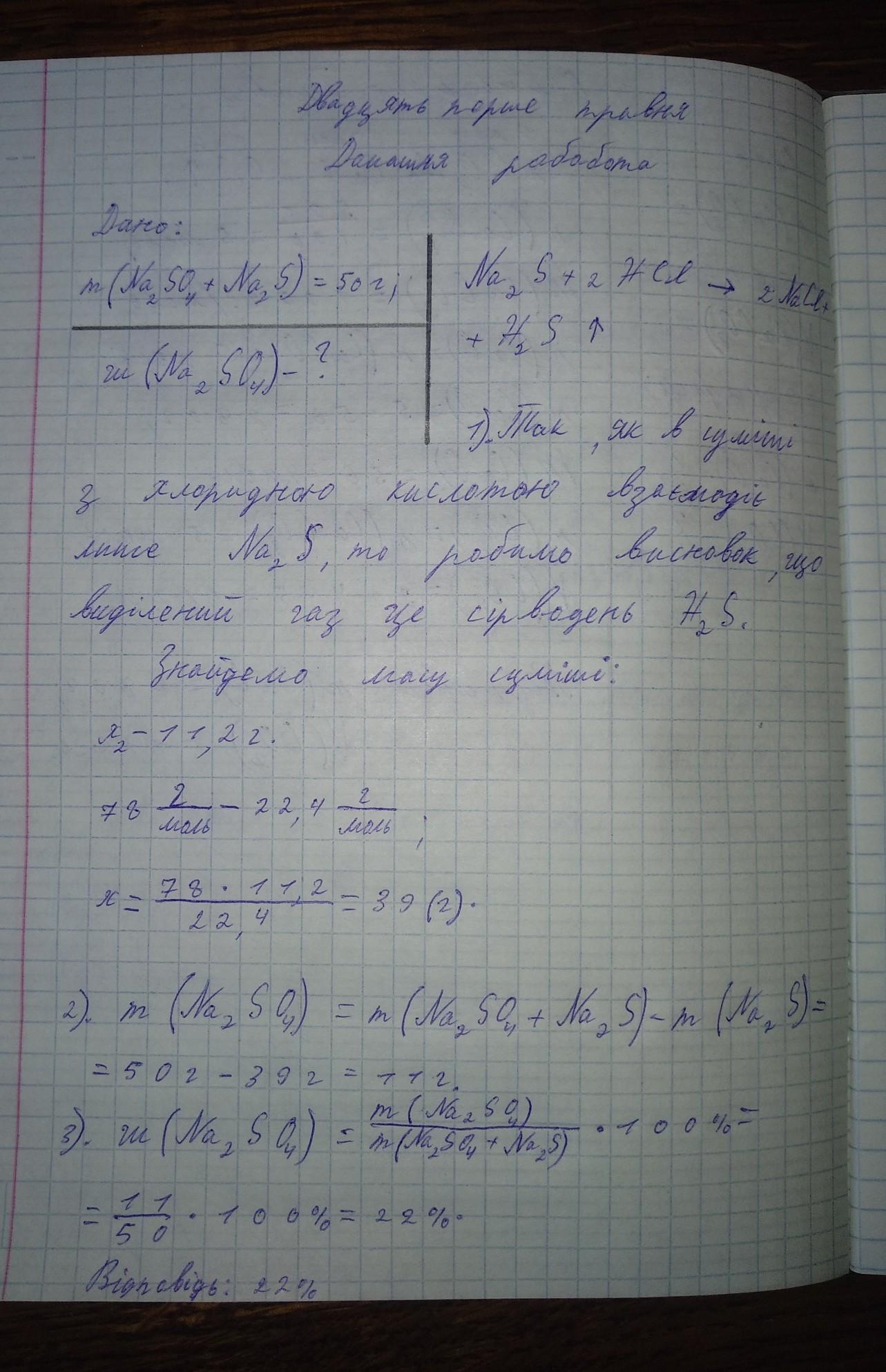 До суміші масою 50 грам, яка складалася з натрій сульфату й натрій сульфіду, добавили хлоридну ктслоту в надлишку. У наслідок взаємодії речовин виділився газ об'ємом 11,2 л (н.у.). Обчисліть масову частку (%) натрій сульфату в суміші