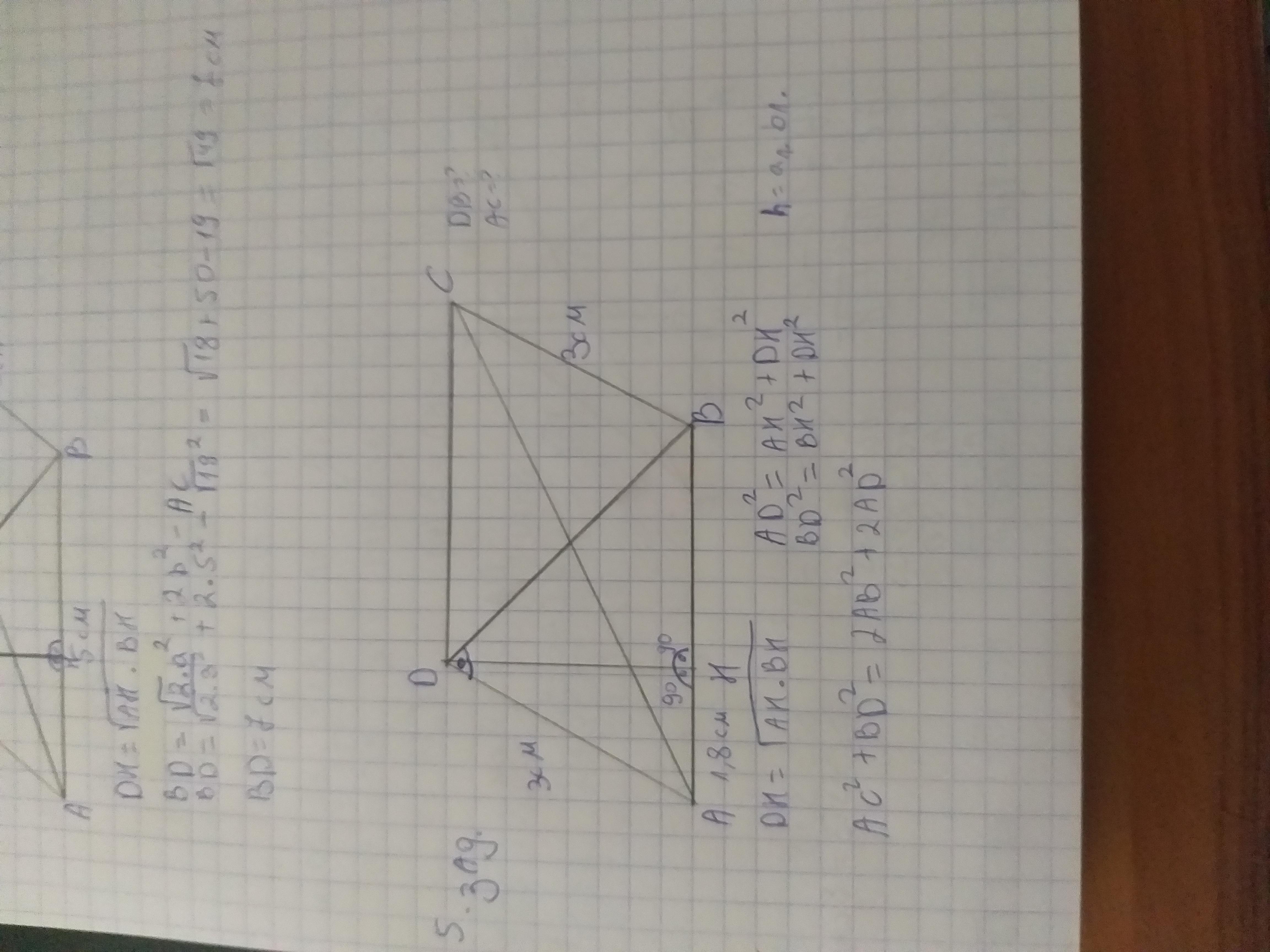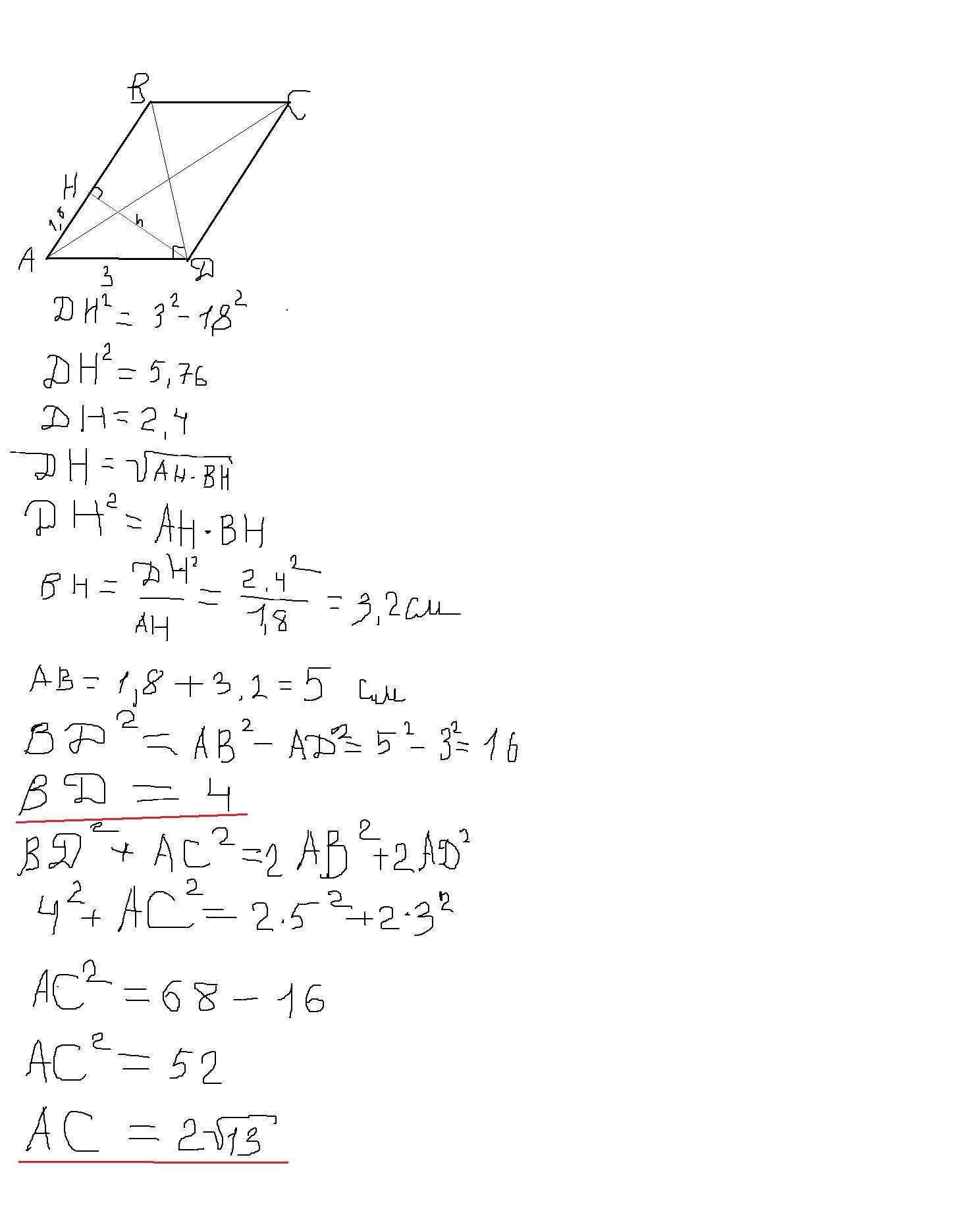 Параллелограмм AВСD ∡АДВ=90° АД=3см ,а h=DН делит сторону AB на сегменты AН и HВ как AН = 1,8 см. Найти AC и ВД! Быстро!