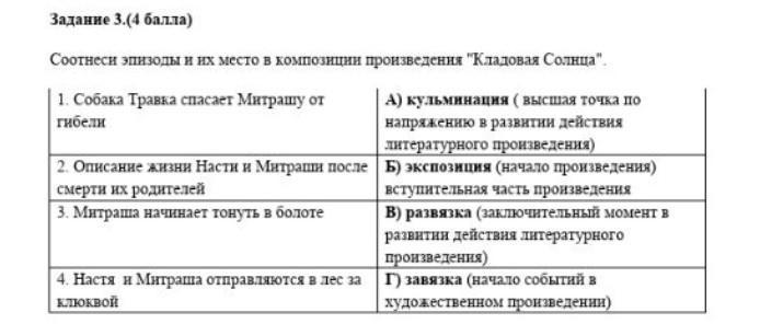 Задание 3. Соотнеси эпизоды и их место в композиции произведения "Кладовая Солнца"(18 баллов)
