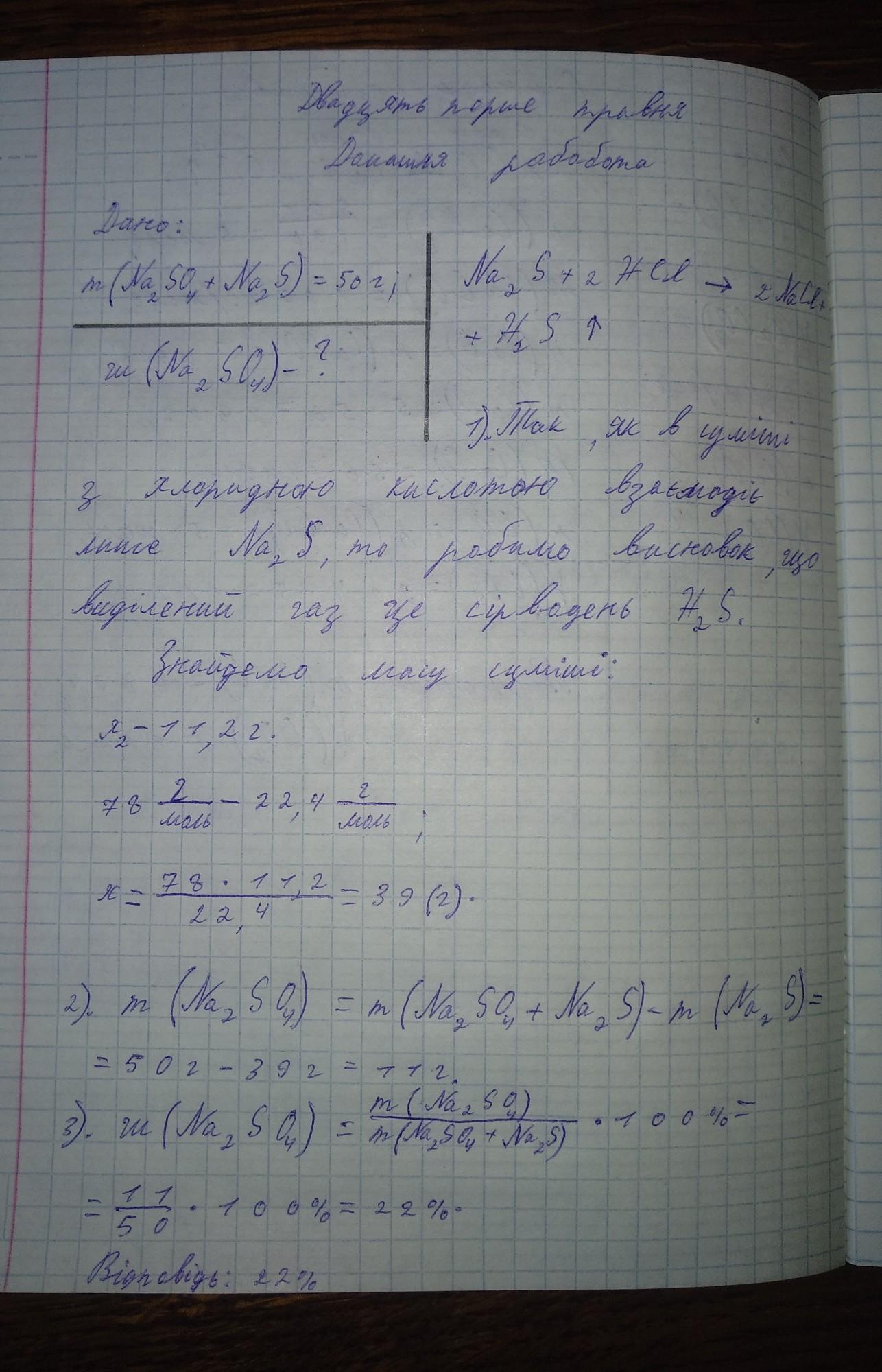 До суміші масою 50 грам, яка складалася з натрій сульфату й натрій сульфіду, добавили хлоридну ктслоту в надлишку. У наслідок взаємодії речовин виділився газ об'ємом 11,2 л (н.у.). Обчисліть масову частку (%) натрій сульфату в суміші