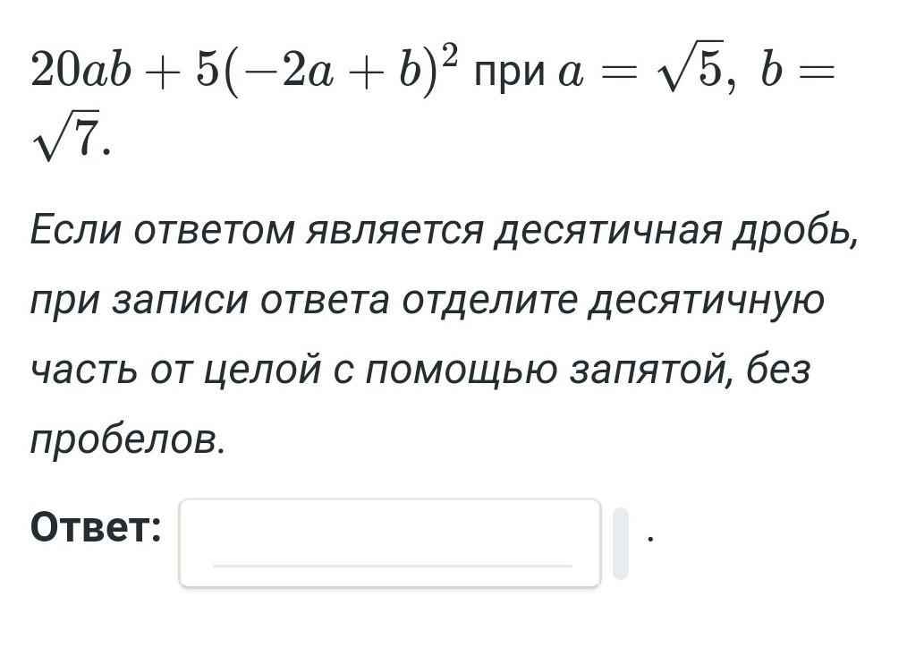 20ab+5·(-2a+b)² = 20ab+5·(4a²-4ab+b²) = 20ab+20a²-20ab+5b² = 5·(4a²+b²) = 5·(4·5+7) = 5·27 = 135