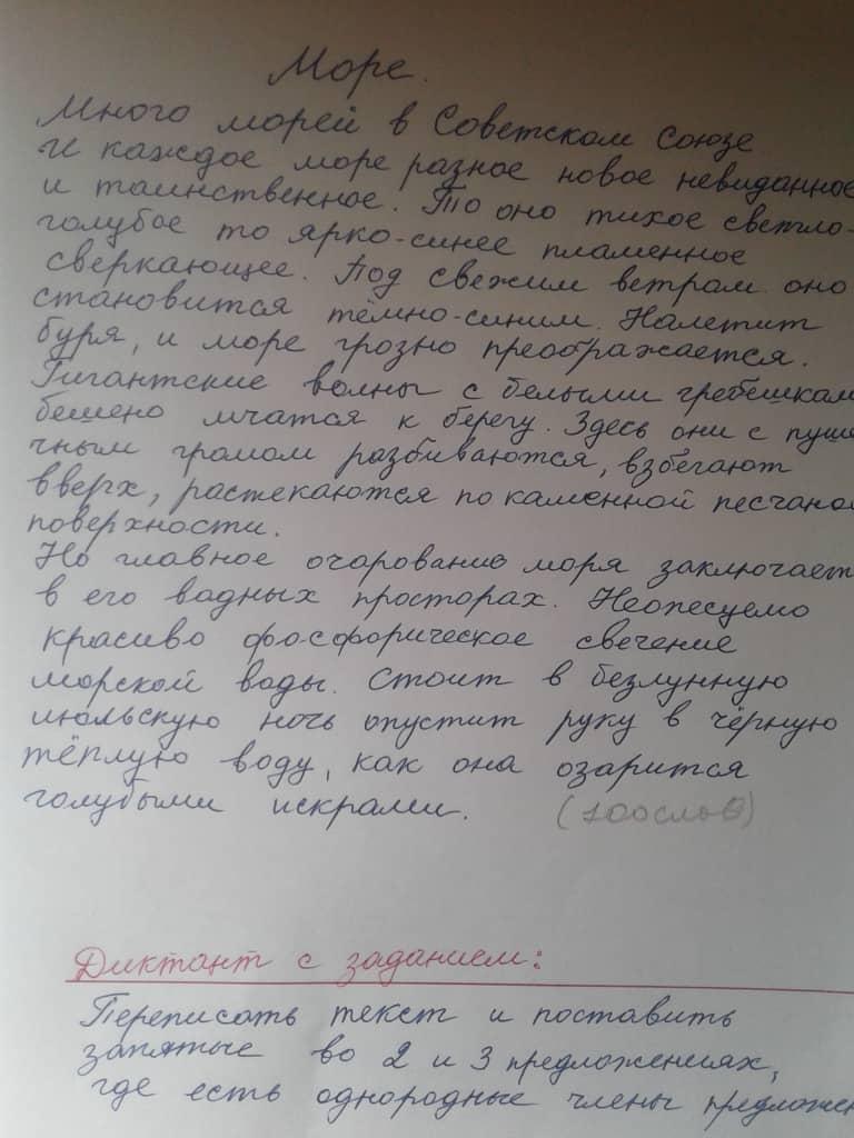 Много морей в Советском Союзе, каждое море разное, новое, невиданное и таинственное. То оно тихое, светло-голубое, то ярко-синее, пламенное, сверкающее. Под свежим ветром, оно становится темно-синим. Налетит буря, и море грозно преображается. Гигантские волны с белыми гребешками бешено мчатся к берегу. Здесь они с ***** (не поняла слово) громом разбиваются, взбегают вверх, растекаются по каменной, песчаной поверхности.