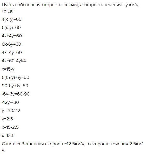 Расстояние между двумя пунктами по реке равно 60км. По течение реки лодка проплывает расстояние за 4ч, а против течения 6ч. Найдите собственную скорость лодки и скорость течения реки