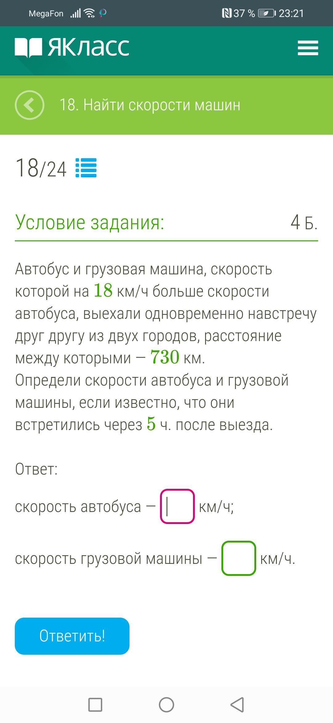 х=64 скорость автобуса, тогда 64+18=82 скорость машины