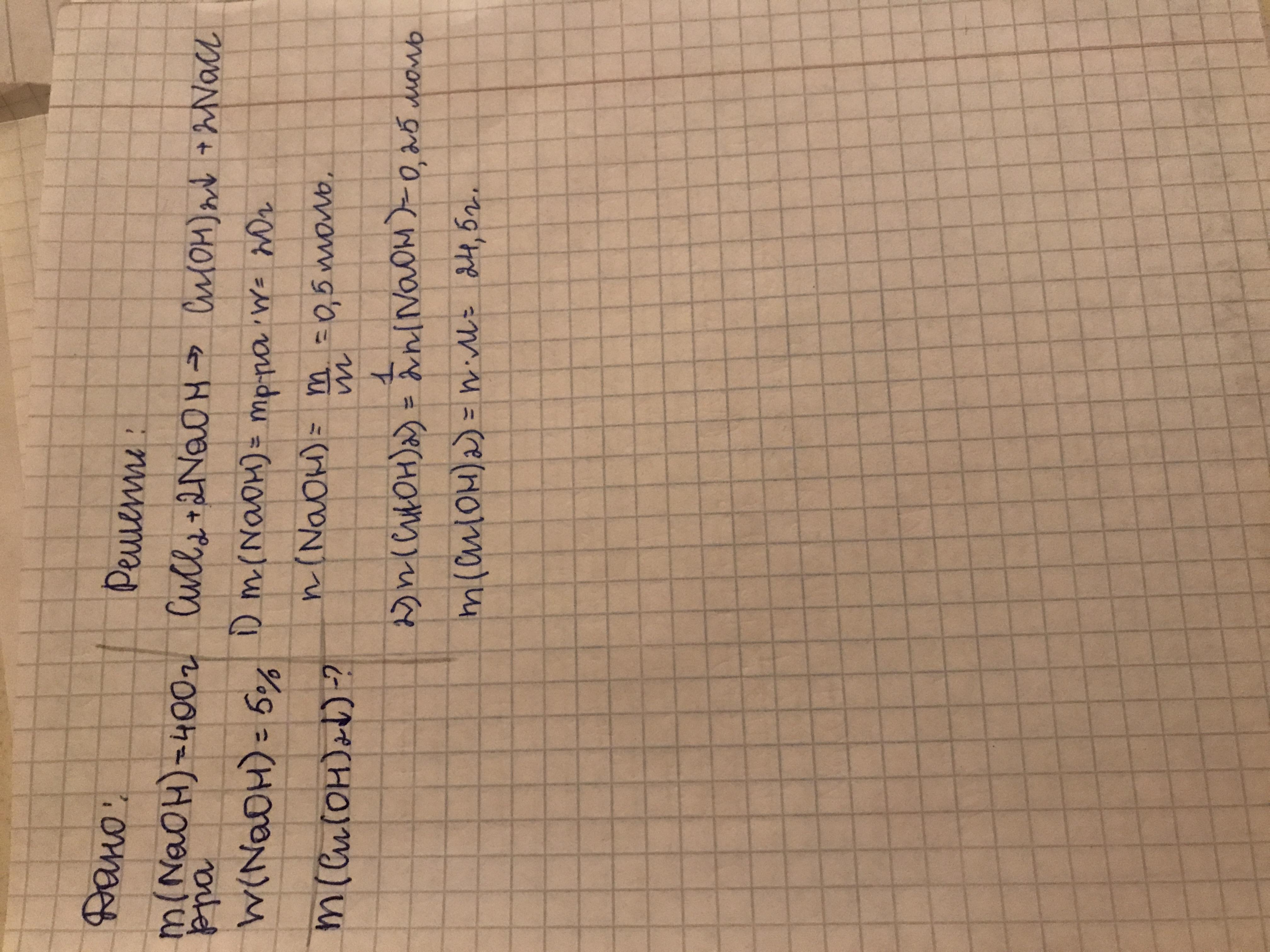 Какая масса гидроксида меди (II) образуется при взаимодействии хлорида меди (II) с 400 г 5% раствора гидроксида натрия.