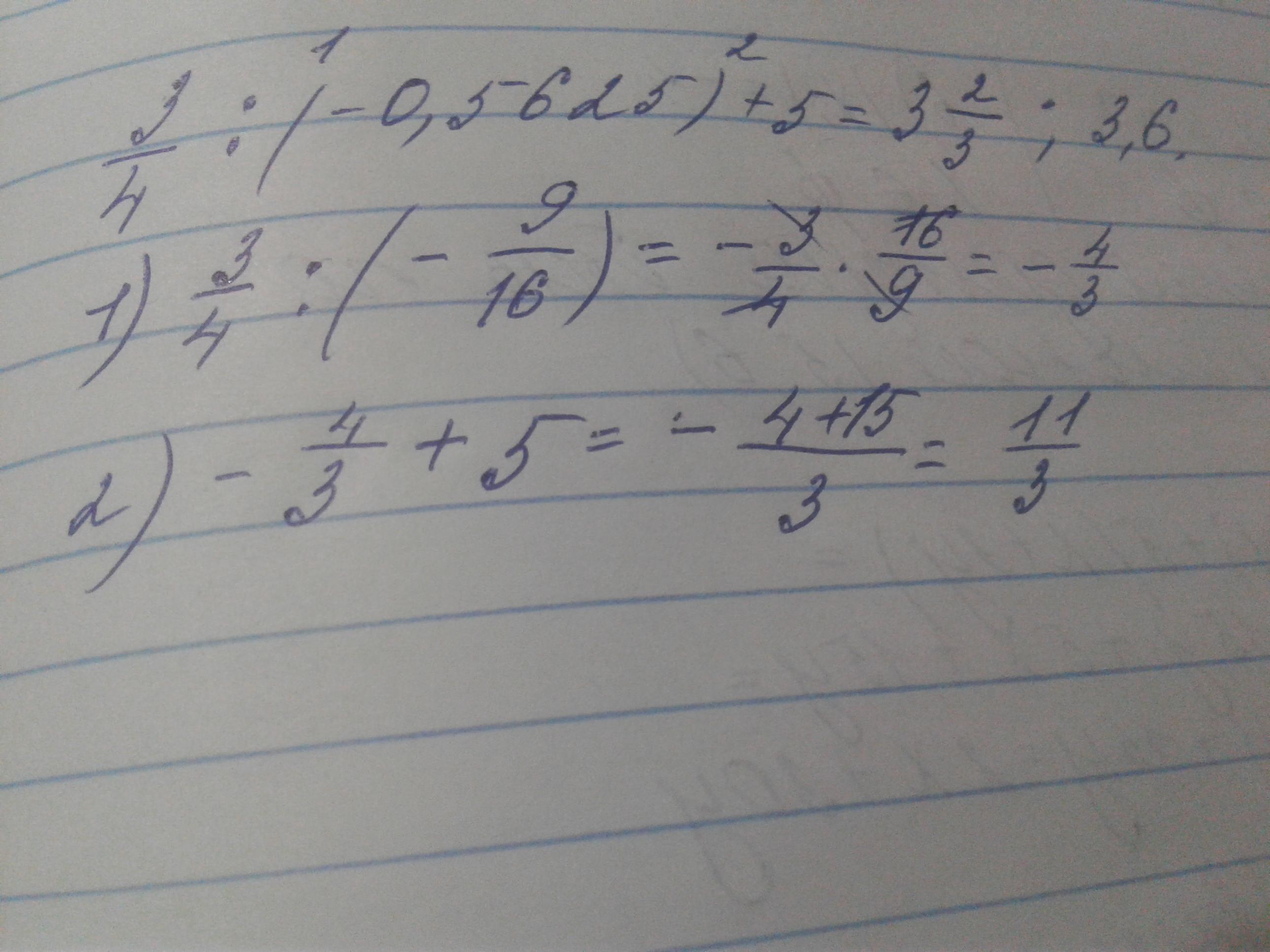 3/4÷(-0,5625)+5= 3/4 : (- 9/16)+5 = -3/4 * 16/9 + 5 = -4/3 + 5 = 11/3 = 3 2/3