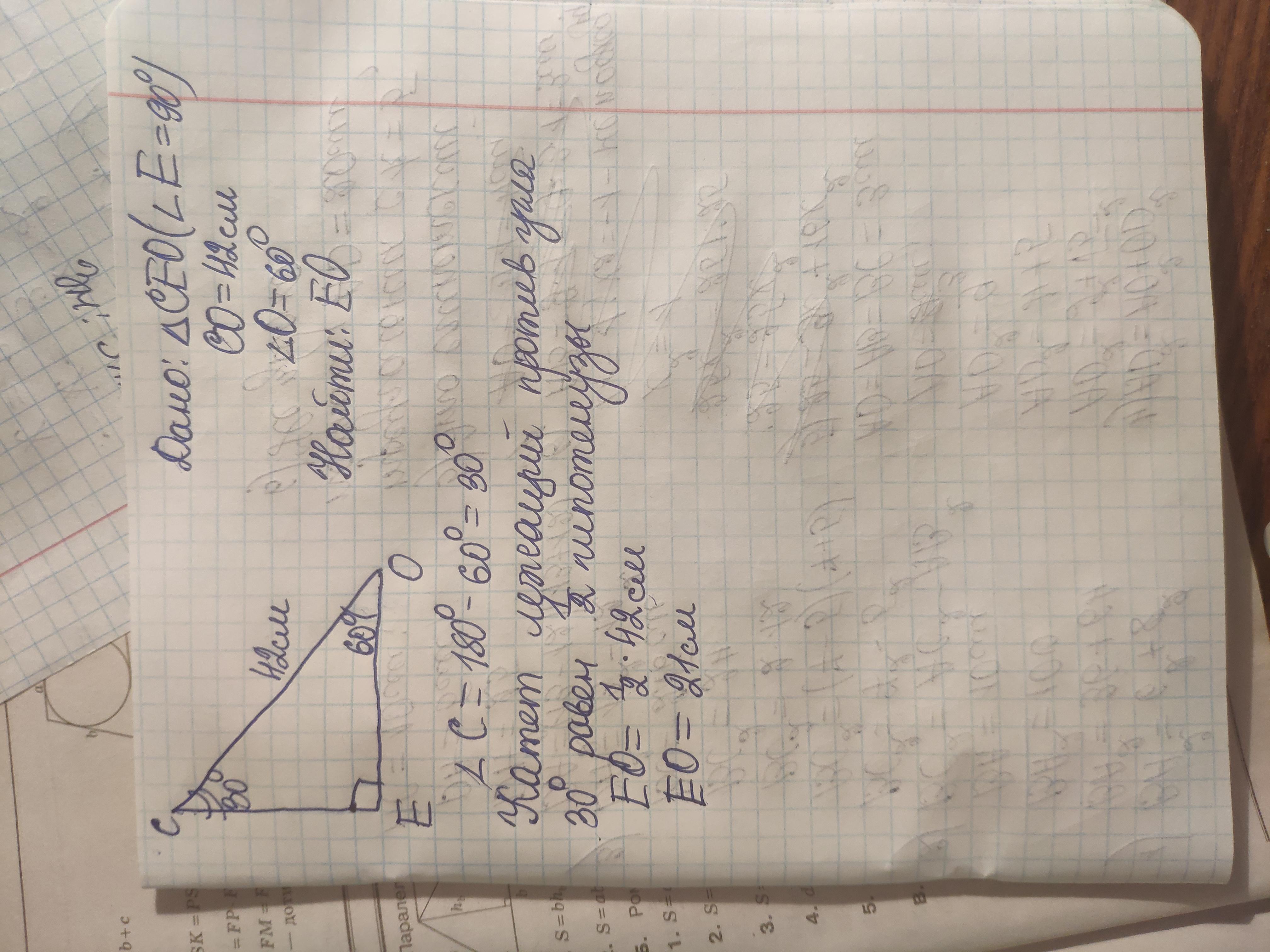 В прямоугольном треугольнике СЕО гипотенуза СО равна 42 см, О = 60˚. Найти катет ЕО.