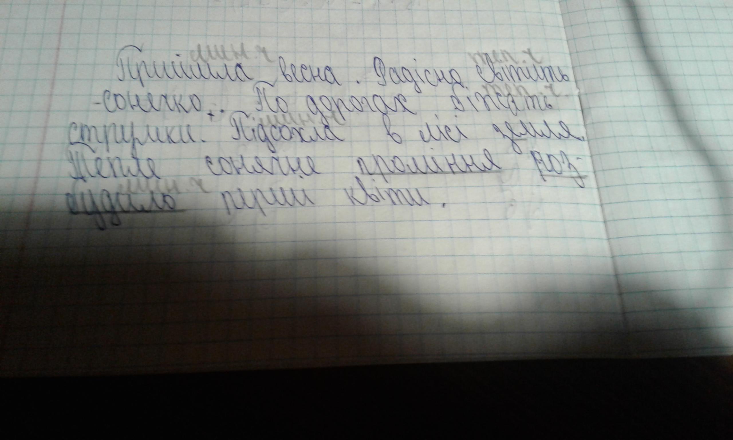 (Настала, прийшла, завітала) в..сна. (Весело, радісно, бадьоро) світить сон..чко. (По)дорогах (мчать, летять, біжать) струмки. (Підсохла, висушилась, випарувалась) (в)лісі з..мля. (Жарке, тепле, гаряче) сонячне промі(н,нн)я ро(с,з)будило перші квіти.