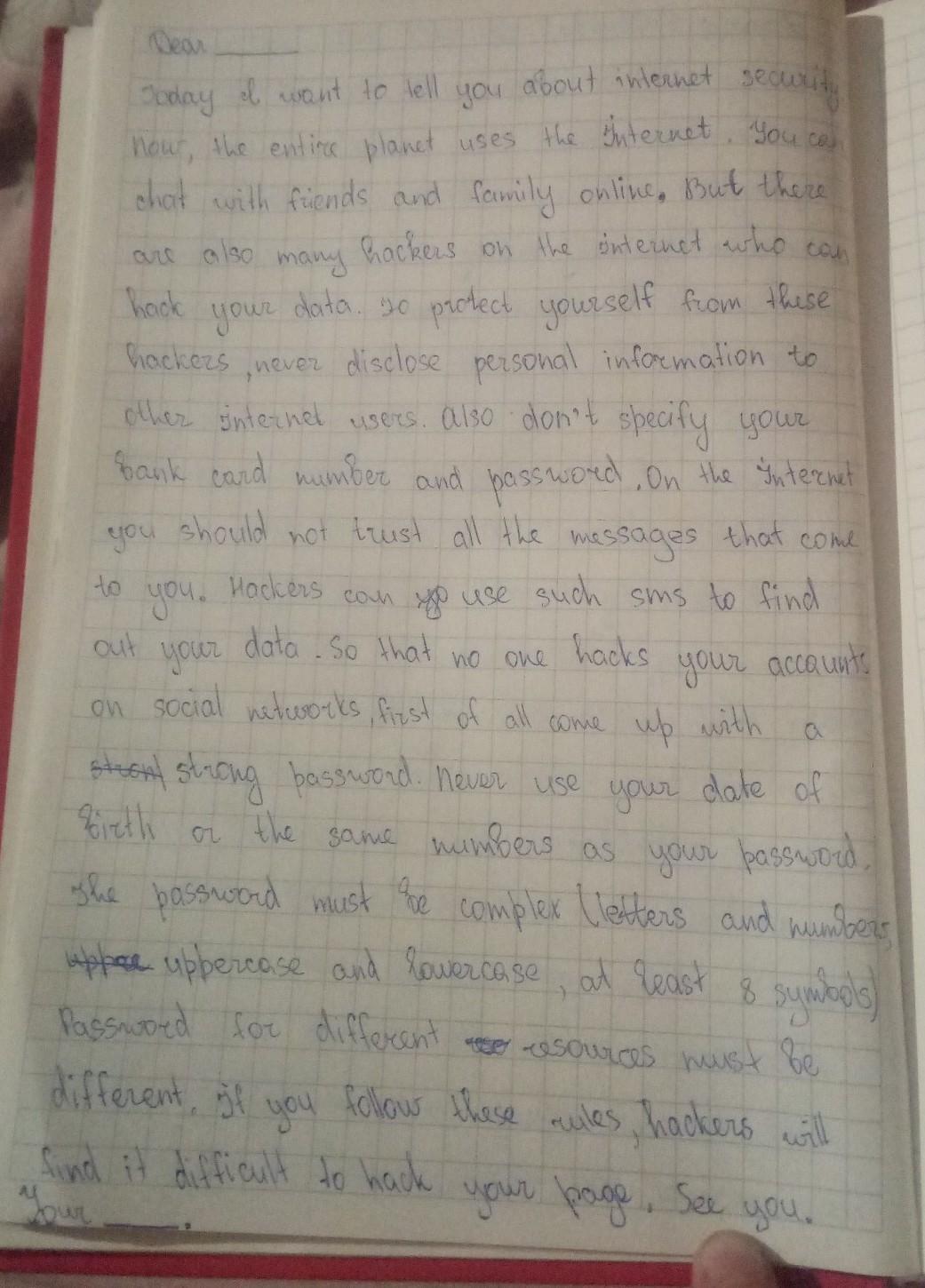 якщо чогось не зрозумієш, звертайся, розшифрую. тема: it is not a secret that the internet os not good or bad for people. ot depends on your attitude to the way that you use it. what dangerous can you face on the internet? how can you protect yiurself from them? give your advice to your pen-pal who spends a lot of time in social networks( перша)