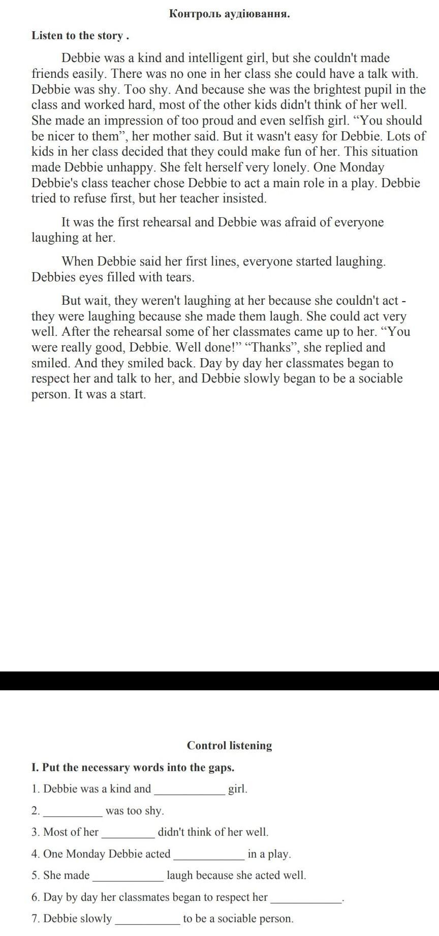 1) intelligent 2)Debbie 3)classmates 4) main role 5) them 6)and talk to her 7)began (надеюсь правильно)