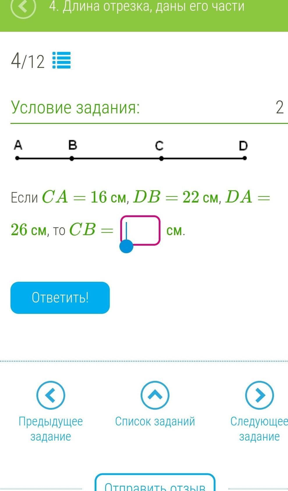 12 см. Решение: DA-СА=26-16=10 ( DC) ; BD-DC= 22-10= 12см CB