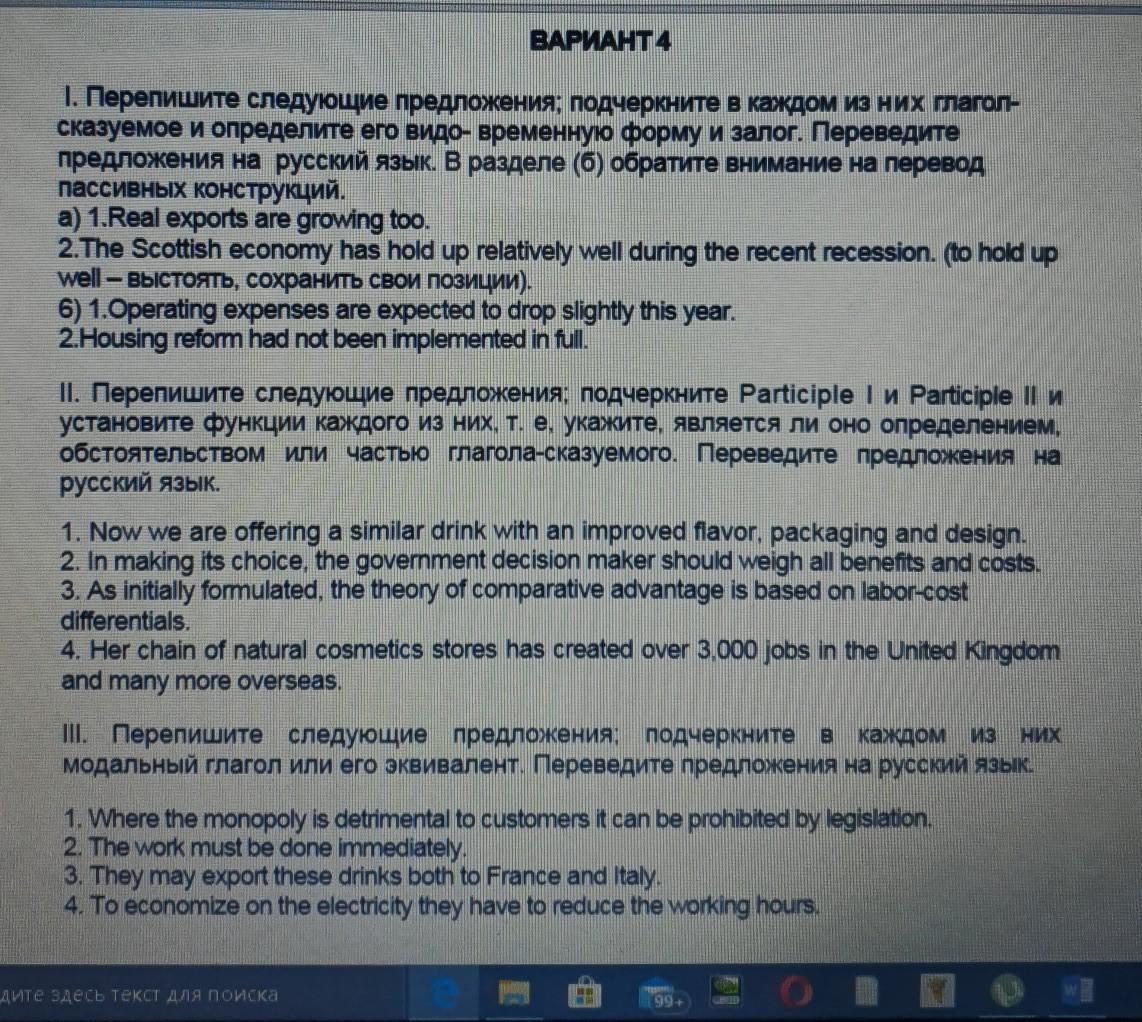 а) 1. are growing - глагол-сказуемое в форме Present Continues Active Voice (залог). Реальный экспорт также растёт. 2. Шотландская экономика сохраняет свои позиции во время недавней рецессии (спада). has hold up - глагол-сказуемое в форме Past Perfect Active Voice (залог). b) 1. Операционные расходы, как ожидается, несколько сократятся в этом году. Are expected to drop - глагол-сказуемое в форме Present Simple Passive Voice.