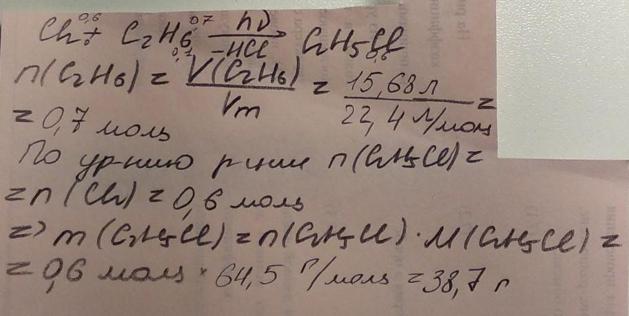 Вычислите массу образовавшегося хлорэтана, полученного при взаимодействии 0,6 моль хлора и 15,68л (при н.у.) этана.