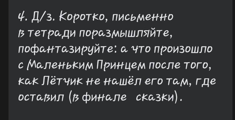 Коротко письменно в тетради поразмышляйте, пофантазируйте, а что произошло с маленьким принцем после того, как лётчик не нашёл его там, где оставил в (финале сказки).