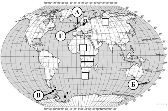 На карте буквами обозначены крупные объекты, через которые проходило плавание, изображенное на рисунке. Запишите в таблицу названия этих объектов.
