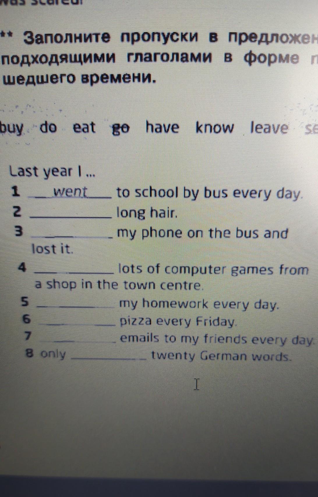 Заполните пропуски в предложениях подходящими глаголами в форме прошедшего времени: bay ;do ;eat ;go;have; know;leave;send;