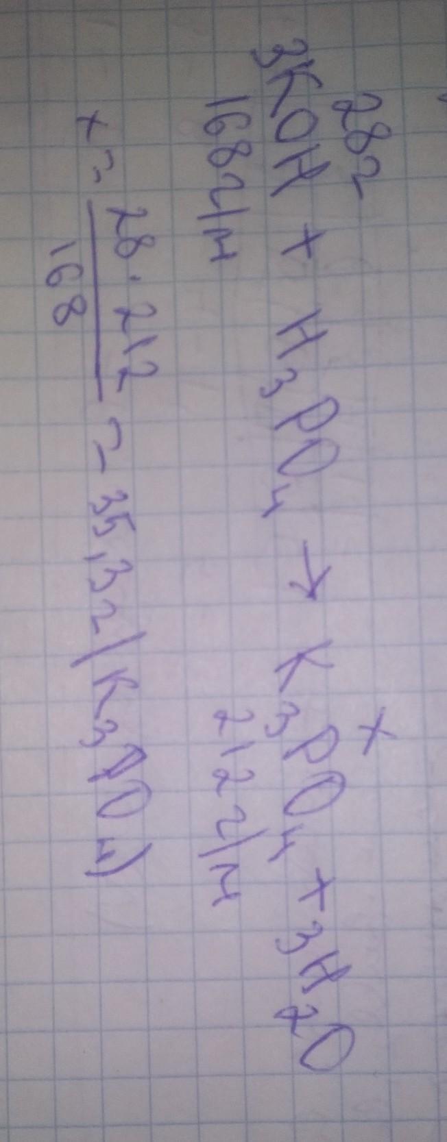 28 грамм калий гидроксиді мен фосфор қышқылы әрекеттескенде пайда болған калий фосфатының массасын тап. Даю 30 баллов. Мне срочно