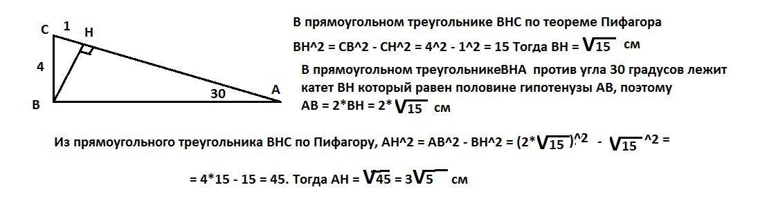 Отрезок BH - высота тоеугольника ABC изображёного на рисунке ,BС = 4 см CH = 1см Найдите длину отрехка AH