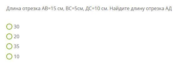 Длина отрезка АВ=15 см, ВС=5см, ДС=10 см. Найдите длину отрезка АД