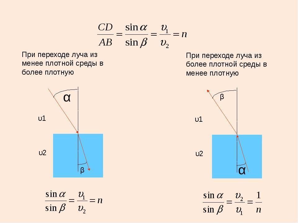 На этих рисунках показано, каким будет ход луча из менее плотной среды в оптическую более плотную среду и наоборот.