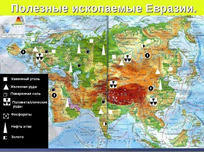 Полезные ископаемые и климат Евразии Евразия очень богата на разнообразные полезные ископаемые. На ее территории имеются крупные месторождения каменного угля, нефти, природного газа, значительные запасы руд черных и цветных металлов, немало мест, где добывают золото и драгоценные камни.