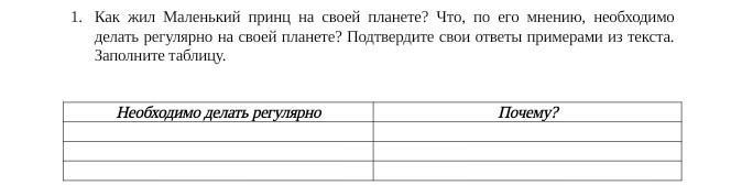 Как жил Маленький принц на своей планете? Что, по его мнению, необходимо делать регулярно на своей планете? Подтвердите свои ответы примерами из текста. Заполните таблицу.