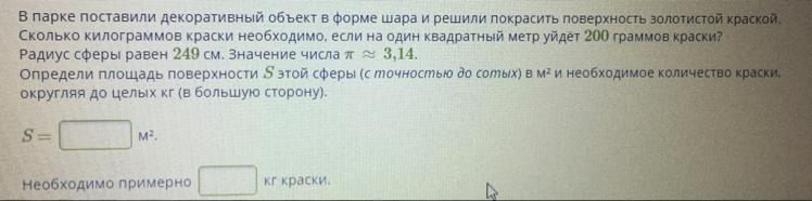 S = 4ПRквадрат = 4*П*2.49квадрат = 78 м квадратних