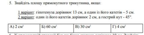 этот треугольник равнобедренный так как третий угол 180-90-45=45°. двамкатеиа равны. формула площади прямокгольного треугольника