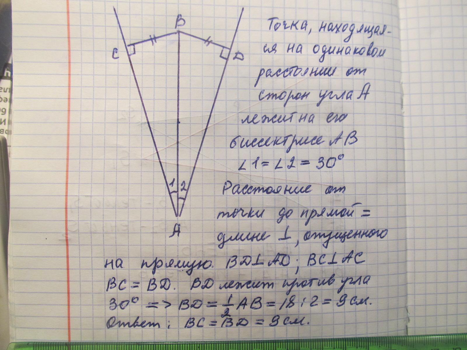 Точка всередині кута, який дорівнює 60°, розташована на однаковій відстані від його сторін. Відстань від вершини кута до цієї точки дорівнює 18 см. Знайдіть відстань від точки до сторін кута.