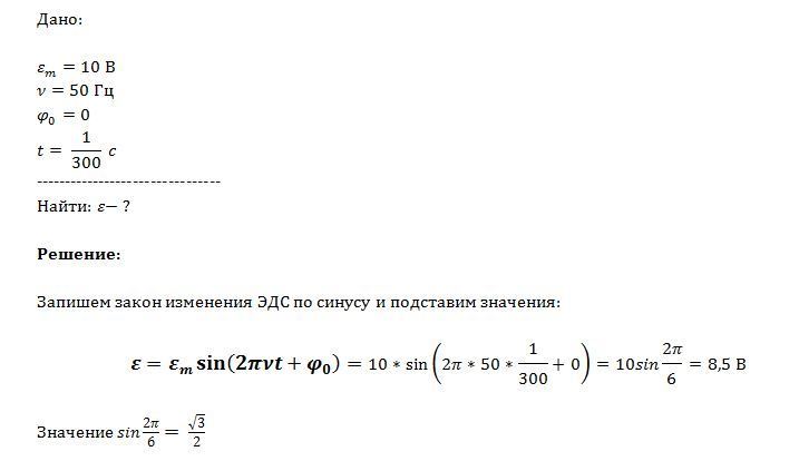 Амплитудное значение синусоидальной ЭДС с частотой 50 Гц равно 10 В. Начальная фаза равна 0. Найдите величину ЭДС в момент времени t= 1/300 c. (t = 8,5 В)