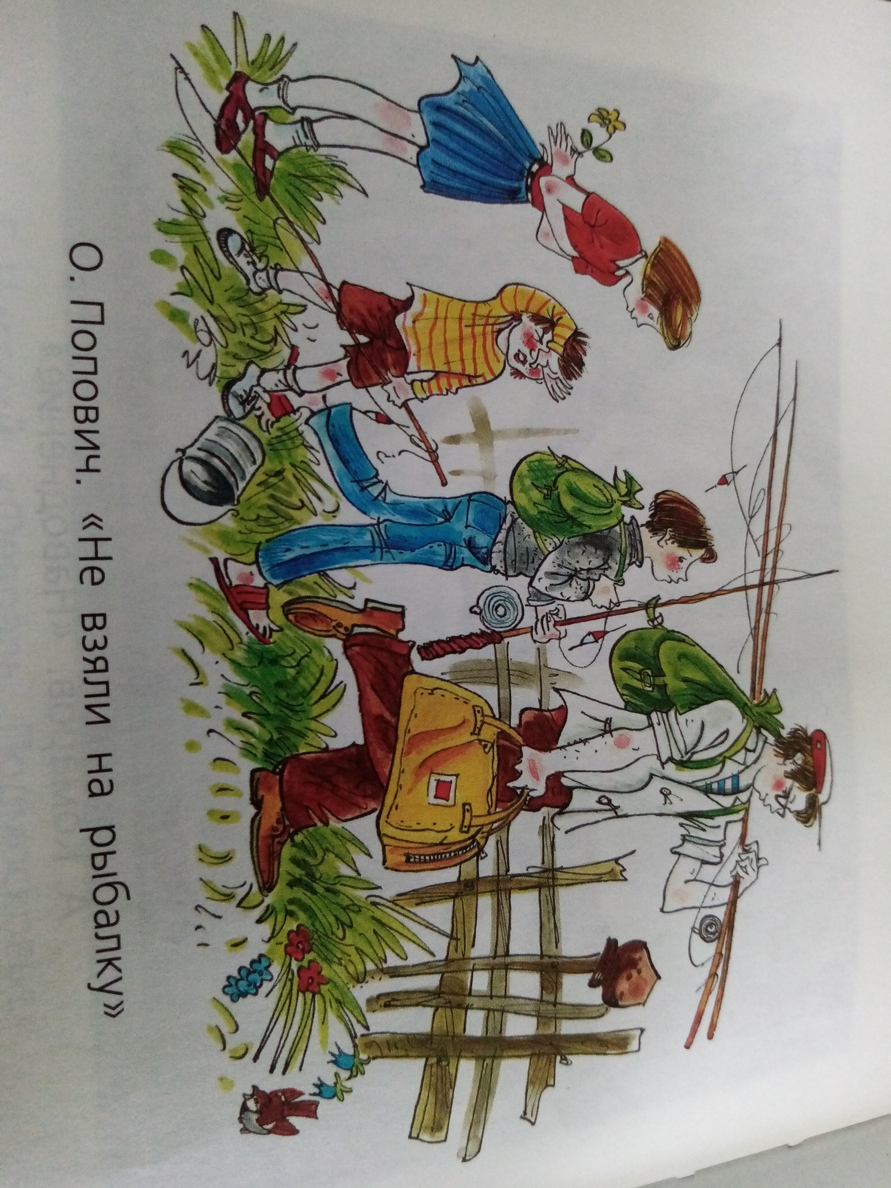 На картинке изображена компания ребят, которые собираются на рыбалку. Высокий мальчик одетый в белый костюм, в сине-белую тельняшку, коричневые штаны и светло-коричневые ботинки несёт на своей спине зелёный рюкзак и жёлтую сумку в руке. На плече он держит удочки. Видно, что тёмноволосый мальчик, самый старший и что он сильно торопится на рыбалку, не обращая внимание на капризного, плачущего, младшего мальчика.